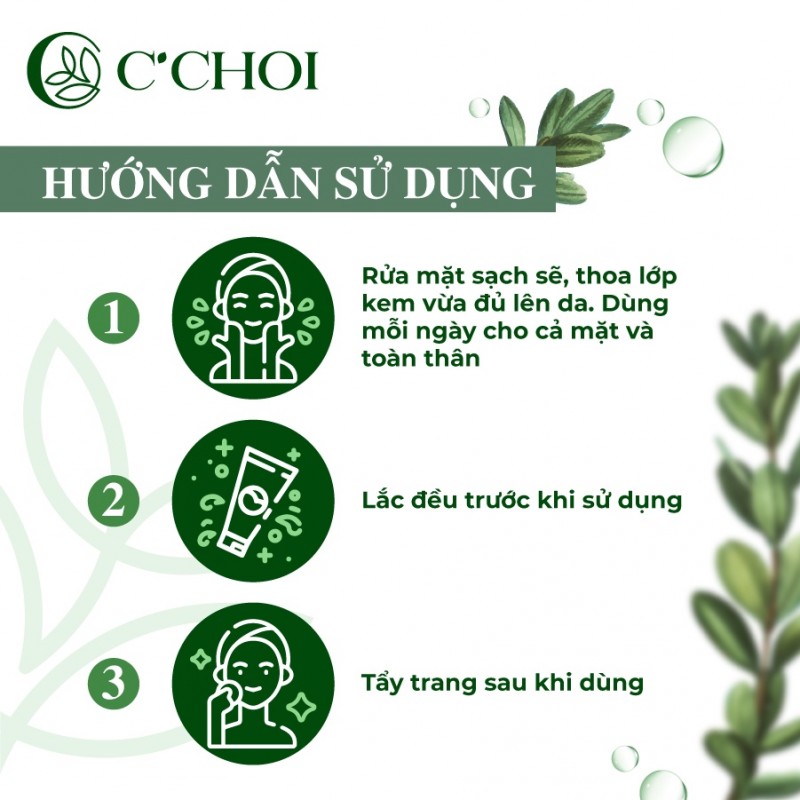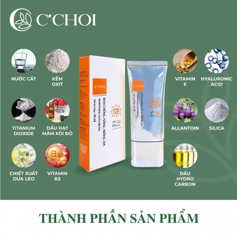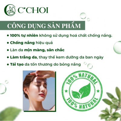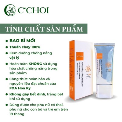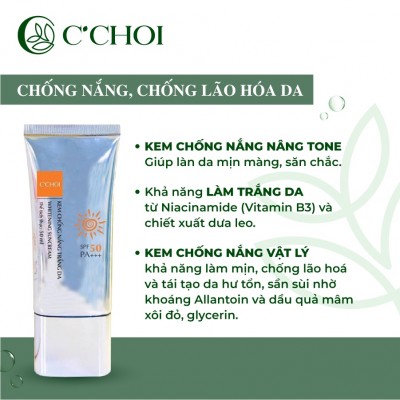 THÔNG TIN SẢN PHẨM- KEM CHỐNG NẮNG C'CHOI là kem dưỡng da với SPF 50, PA+++, có khả năng chống cả tia UVA và UVB đồng thời dưỡng trắng da, giúp bạn có một làn da khỏe mạnh. Khả năng chống nắng có được là nhờ khoáng chất, dầu và chiết xuất thực vật.