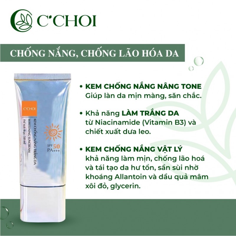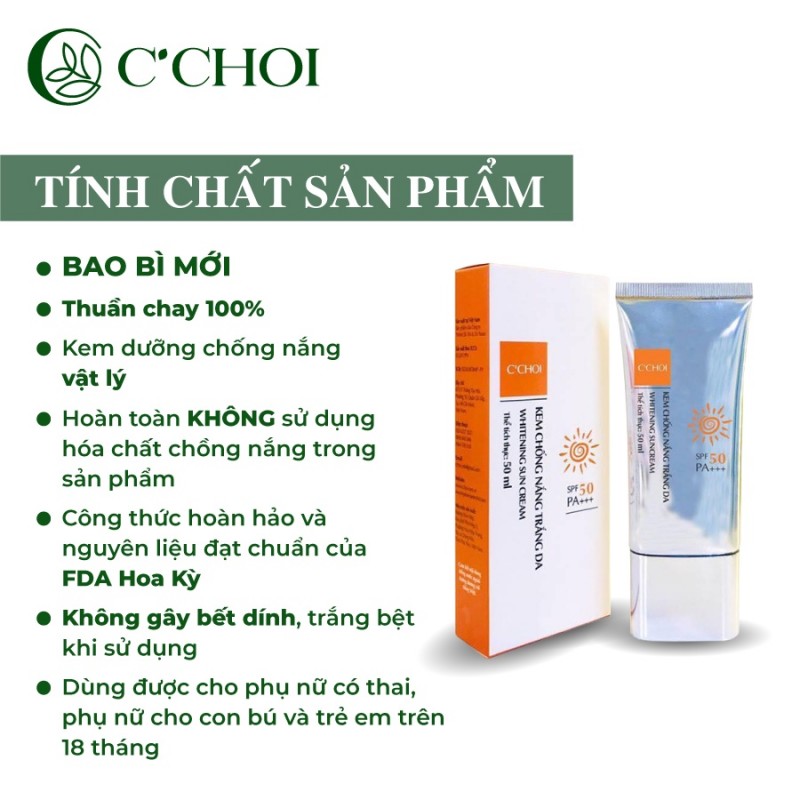 | Tên sản phẩm | Kem Chống Nắng Trắng Da C'CHOI SPF50 PA++ Bảo Vệ Làn Da Tối Ưu Hoạt Chất Dịu Nhẹ Dưỡng Ẩm Chống Lão Hóa 50gr |