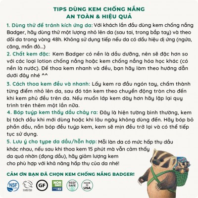 Badger là thương hiệu mỹ phẩm hữu cơ hàng đầu tại Mỹ. được thành lập từ năm 1996. Sản phẩm đặc sắc của Badger phải kể đến Kem chống nắng vật lý, sản phẩm chăm sóc mẹ & Bé, sản phẩm chống muỗi.Tất cả sản phẩm của Badger đều được chứng nhận Organic (USDA organic hoặc NSF Organic), không thử nghiệm trên động vật (Cruelty-free) và không dùng thành phần biến đổi gen (Non-GMO). Kem chống nắng Badger được EWG xếp hạng 1- hạng cao nhất về độ an toàn và hiệu quả, được khuyên dùng bởi nhiều tờ báo và tổ chức uy tín.???? Sản phẩm được nhập khẩu và phân phối chính hãng