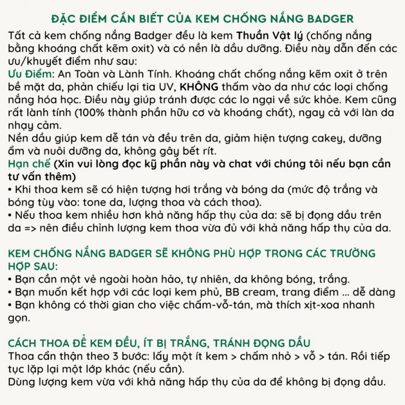 - M rất ưng các sản phẩm của badger, nhưng kcn này không mê đc. Kem đậc khó lấy ra, lấy ra thì tán rít, tán xong da rất dính ko đc khô ráo, cảm giá bí da lắm. Ko recmt cho các mẹ dùng so này cho bé