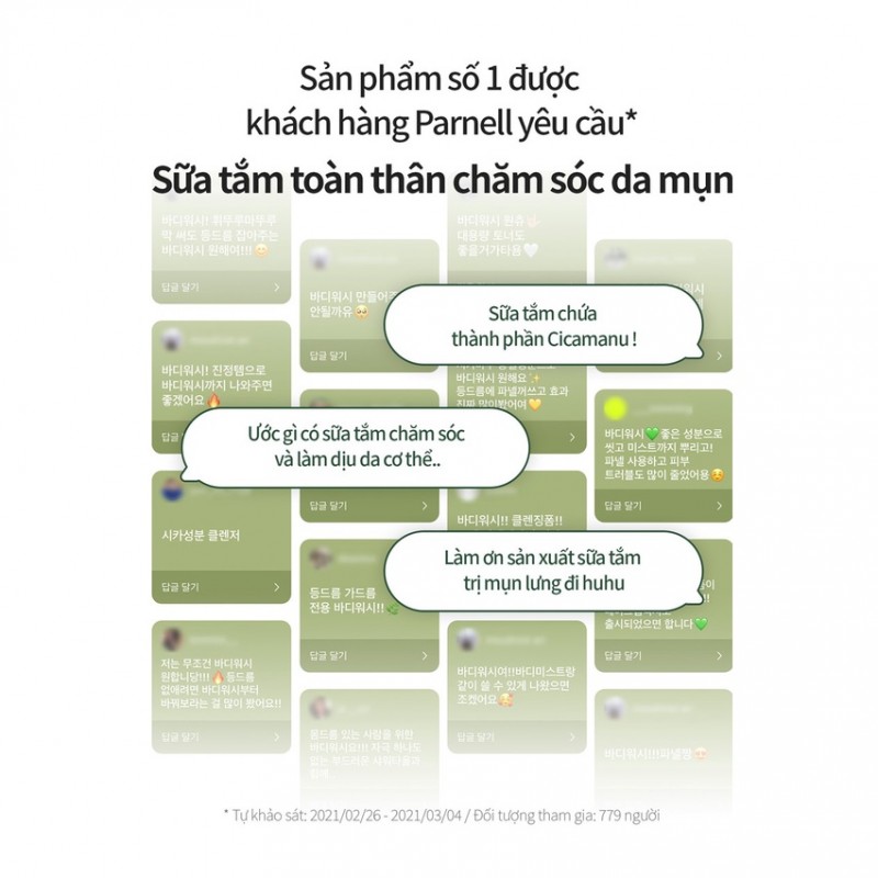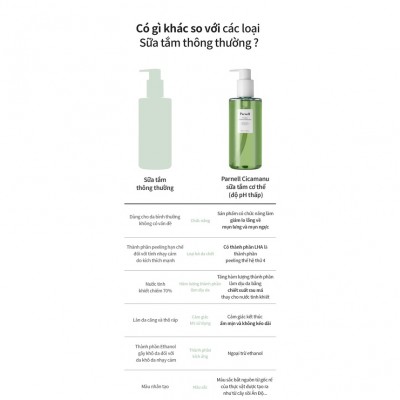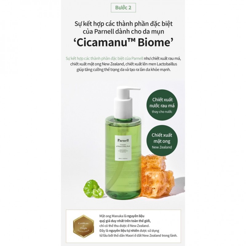 | Tên sản phẩm | PARNELL Sữa tắm giảm mụn cơ thể Cicamanu độ pH thấp 400ml |