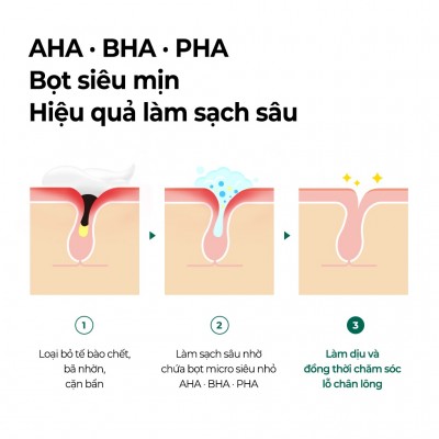 - Chứa AHA-BHA-PHA giúp làm sạch bụi bẩn, nhẹ nhàng loại bỏ lớp tế bào da chết, làm thông thoáng lỗ chân lông, kiểm soát lượng bã nhờn, cải thiện tình trạng da xỉn màu, giúp da sáng mịn.