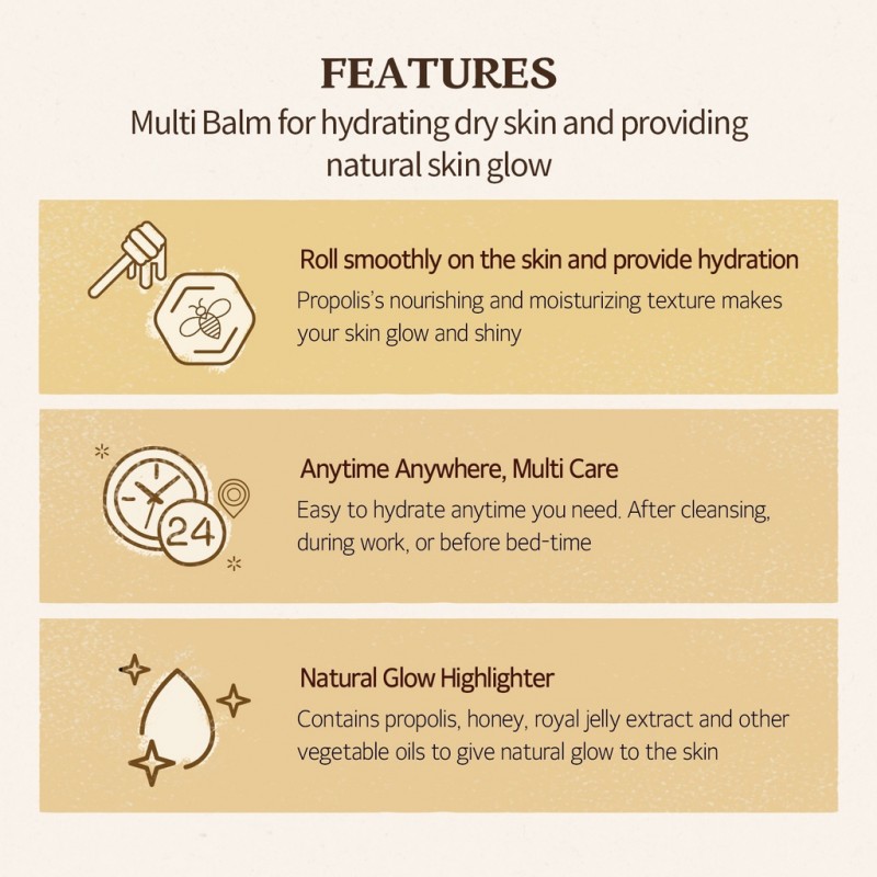* Lăn nhẹ nhàng trên da và cung cấp độ ẩm: Kết cấu dưỡng ẩm và nuôi dưỡng của keo ong giúp cho làn da của bạn sáng và bóng hơn.