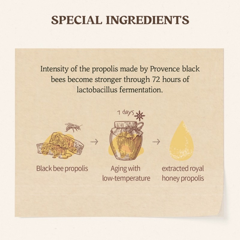 Keo ong được tạo ra bởi loài ong đen sống ở Provence, một vùng quê miền nam nước Pháp, có sức sống mãnh liệt và giàu năng lượng đặc biệt giúp củng cố hàng rào bảo vệ da.