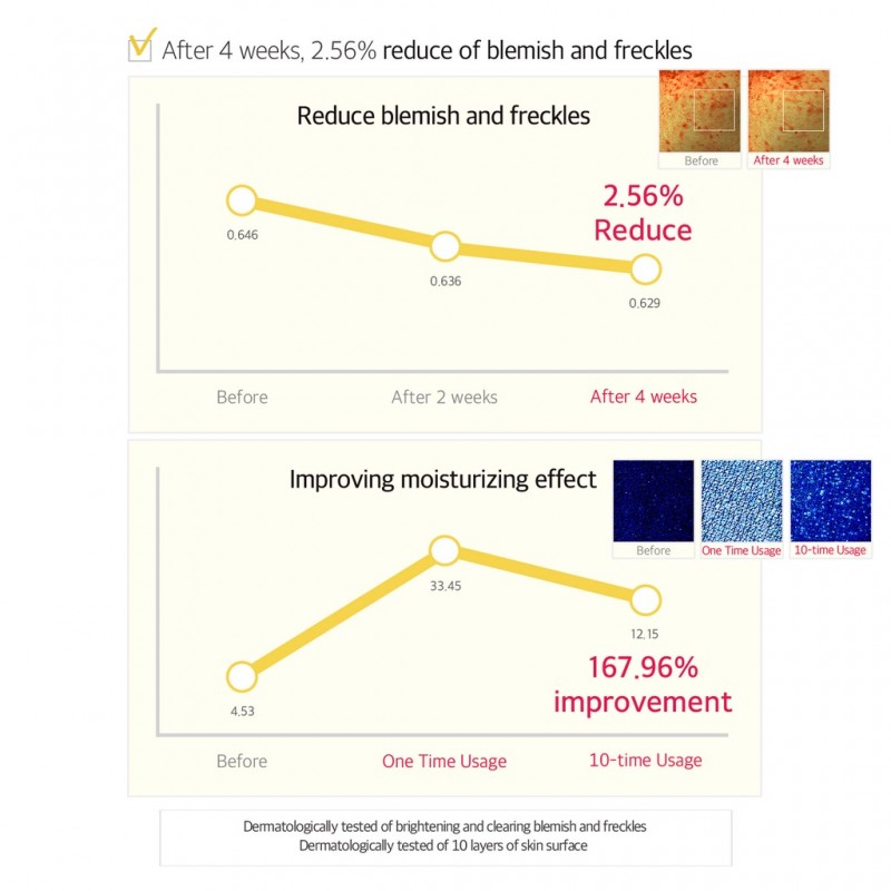 Serum: Giảm tàn nhang 2.5% và cải thiện mức cân bằng nước 167.96% sau 4 tuần sử dụng.
