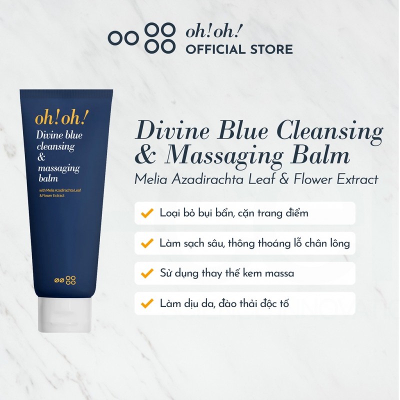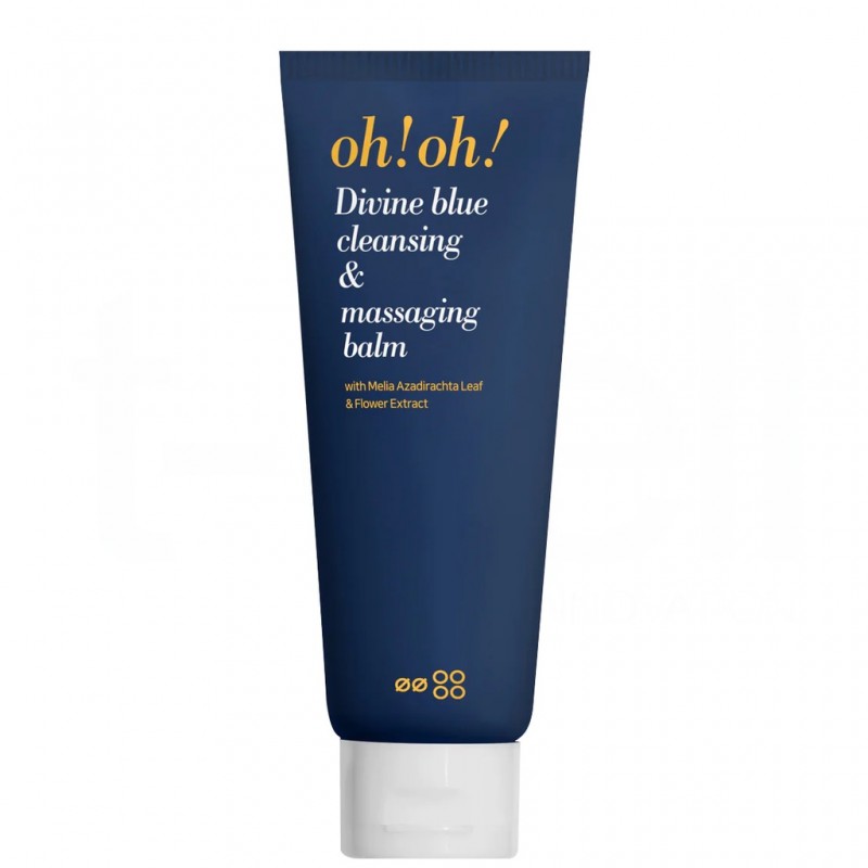 oh!oh! Divine Blue Cleansing & Massaging Balm là sản phẩm tẩy trang dạng sáp giúp nhẹ nhàng loại bỏ lớp makeup, bụi bẩn và tạp chất mà không làm khô căng bề mặt da. Đặc biệt, công thức sản phẩm có chứa chiết xuất Melia Azadirachta siêu giàu chất chống oxy hóa giúp trung hòa các gốc tự do gây hại, từ đó bảo vệ và làm dịu làn da trước các tác nhân gây hại từ môi trường. Ngoài ra, chiết xuất tảo đỏ Corallina Officinalis trong bảng thành phần nổi bật với đặc tính nhẹ nhàng loại bỏ tế bào chết, mang lại một làn da sáng, đều màu và săn chắc hơn.