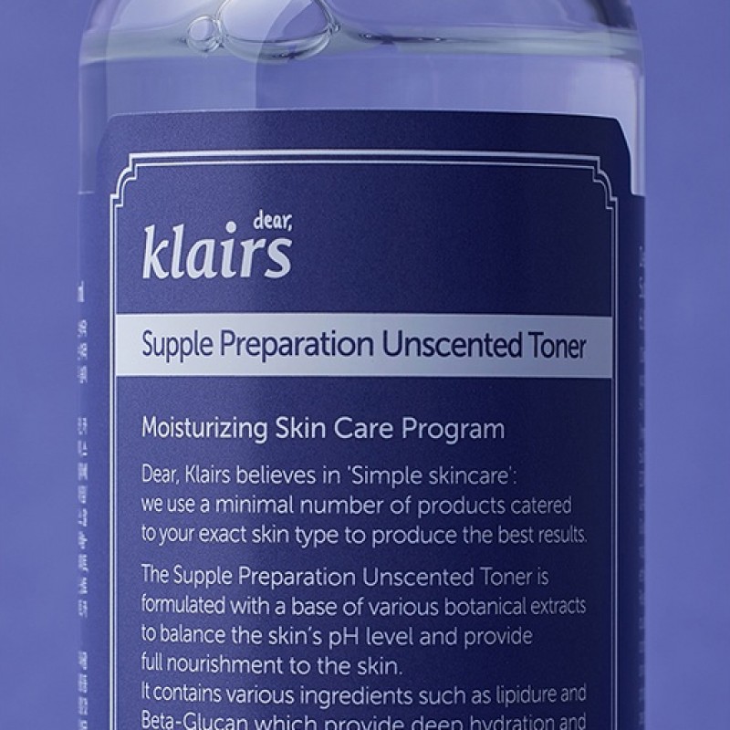Nước hoa hồng không mùi Dear, Klairs Supple Preparation Unscented Toner dưỡng ẩm và mềm da chiết xuất từ thực vật, giúp cân bằng độ pH, tăng cường hiệu quả chăm sóc da. Toner có dạng trong suốt, không màu, lỏng, nhẹ, hơi nhớt, thấm rất nhanh trên da. Giúp loại bỏ bụi bẩn và bã nhờn dư thừa trên da sau khi rửa mặt đồng thời cân bằng độ pH để các bước skincare tiếp theo đạt hiệu quả hơn.