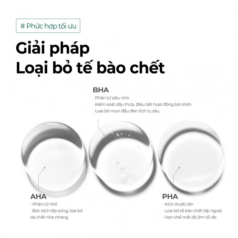 - Phức hợp AHA-BHA-PHA với tỷ lệ tối ưu làm sạch lỗ chân lông và ngăn ngừa m ụn trứng cá.